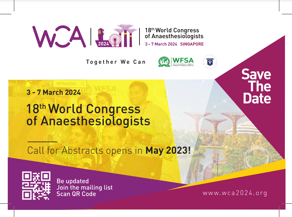 Der 18. World Congress of Anaesthesiologists findet vom 03.- 07.03.2024 in Singapur statt. Weitere Informationen finden Sie im Anhang.