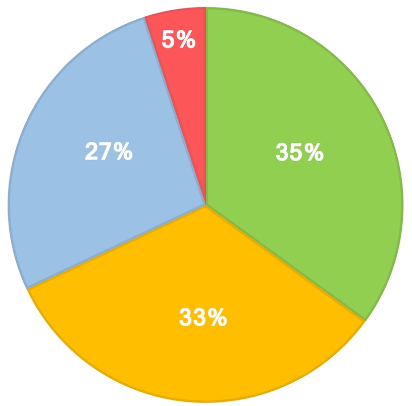 Abb. 1: Vier verschiedene Evidenzgrade der einzelnen Empfehlungen von eGENA. Je ein Drittel der augenblickich 54 Empfehlungen beruhen auf spezifische Empfehlungen anästhesiologischer Fachgesellschaften (grün) bzw. auf generellen Leitlinien, welche von der Arbeitsgruppe auf den peri- bzw. intraoperativen Notfall adaptiert wurden (gelb). Ungefähr ein Viertel der Seiten stellen eine Synthese aus Inhalten anderer ‚Notfallmanuals‘ dar (blau). Für einige wenige Notfälle wurde der Inhalt von Übersichtsartikeln konsentiert (rot).